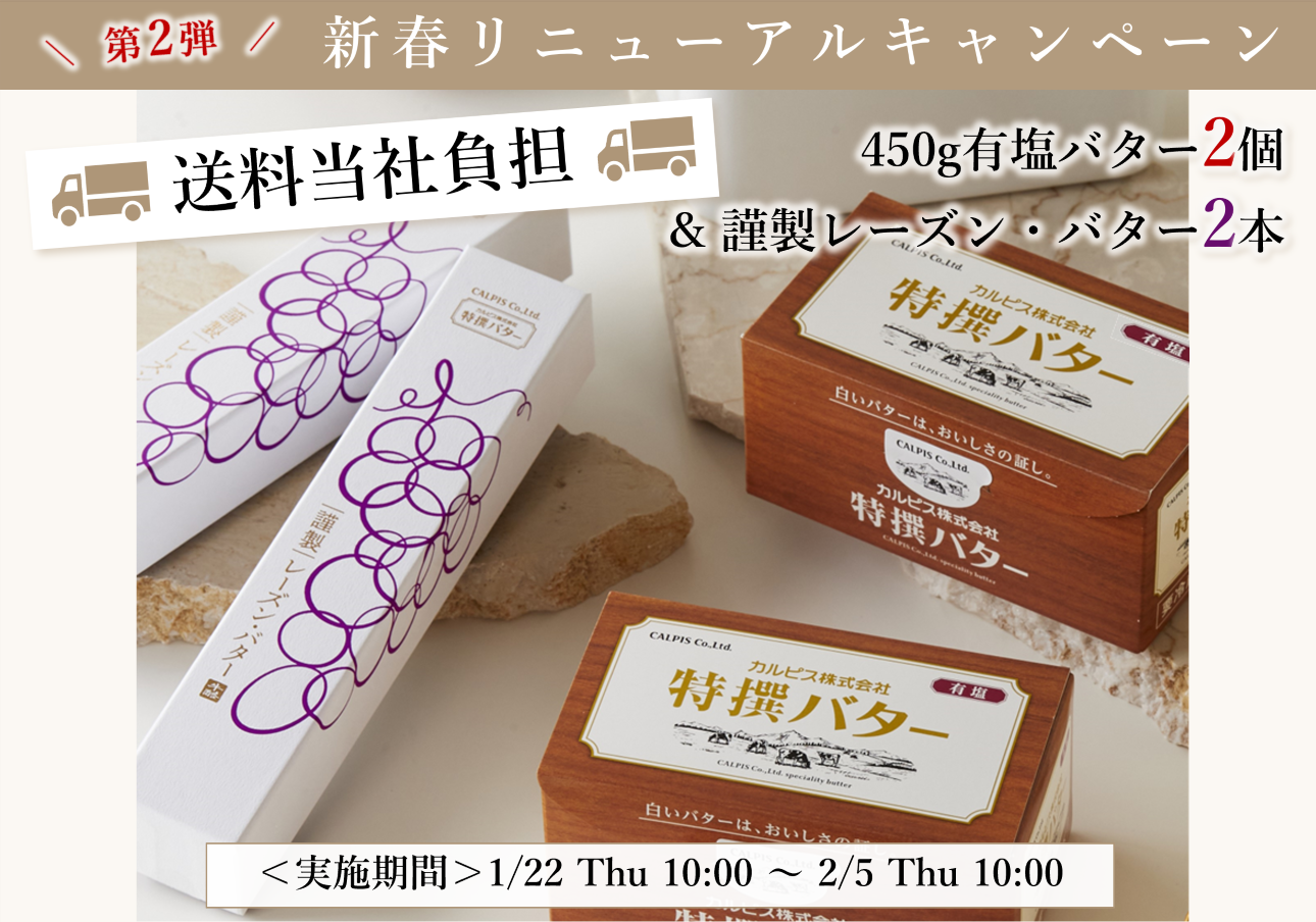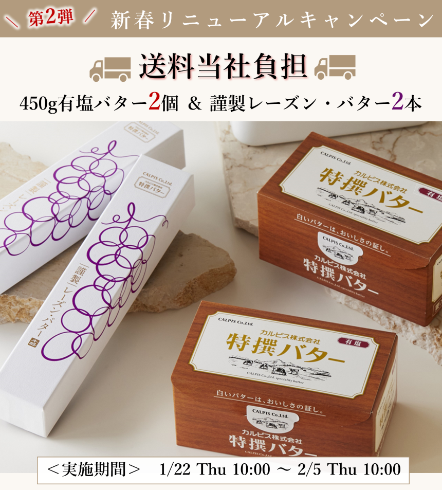 2026年01月22日【キャンペーン情報】450g有塩バター2個&謹製レーズン・バター2本 送料当社負担キャンペーン